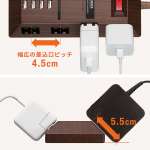 差し込み口の間隔は4.5cmと一般的なものよりも広く取られていて、小型のACアダプタであれば隣同士で干渉しないつくり。側面が斜めなので、差込口から5.5cmの幅のアダプタであれば差し込んだ状態で床にぶつかりません。