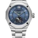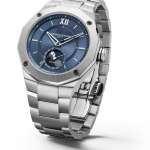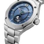 「Riviera 10682」(67万1000円)は、“月から見た地球”をイメージしたというブルーのカラーダイヤルが美しいモデル。風防とダイヤルをつなぐフランジ、インダイヤルの日付表示リングの外周も同じくブルーラッカーでカラーリング。また、フランジの数字や秒針にターコイズやグリーンを添えるなど、瑞々しい色使いは眺めるほどに目を楽しませてくれます。ストラップにはポリッシュとサテンで仕上げを使い分けたステンレススティール製ブレスレットを採用、ケースとの一体感も楽しめます。