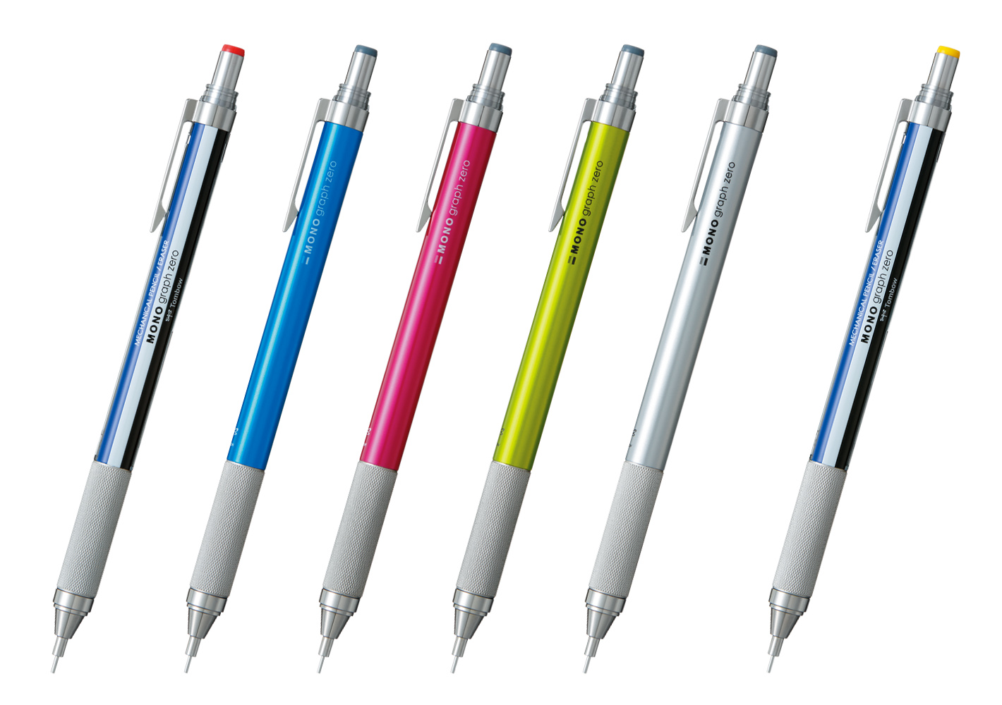 0.5mm芯対応と0.3mm芯対応の2種類あり、ボディカラーには、トンボのロングセラー・MONO消しゴムでおなじみの「モノカラー」を採用。0.3mm芯はモノカラー1色、0.5mm芯はモノカラーの他に、ライトブルー、ピンク、ライム、シルバーの計5色をラインナップする。8月8日より発売、価格は各648円。