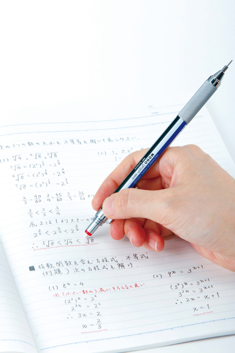 またノック部分には回転繰り出し式MONO消しゴムを搭載。直径2.3mmの極細消しゴムは、小さな文字でも正確に消せる。緻密に書き込み、消したい所だけ正確に消せるため、日常的なメモやスケッチ、また語学学習・資格取得の勉強などにうってつけだ。