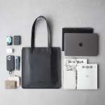 「フラットレザートート」では、ユーザーのニーズに合わせて機能面をアップデート。素材は、ブランドの定番バックパックでも採用されている防水レザーに切り替えられました。