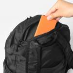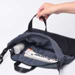 内装には仕分け収納に便利なオープンポケットを装備。さらに、前持ちしたときに便利な上部のファスナーポケットや、背面にキャリーオンできるテープが施されているなど、細部にこだわった仕様です。サイズはW305×D135×H445mmで、重さは210g。