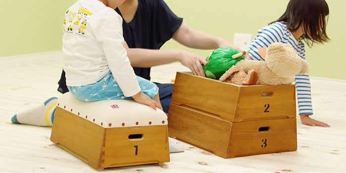 いちばん大きい「とび箱BOX(おもちゃ箱)」(19600円)は、3段のBOXを重ねるタイプ。W335×D390×H440mmと大型なので、子供の椅子としても使えるし、こんなかわいいBOXなら、子供たちも自分でお片付けしてくれるはず!? おもちゃだけでなく衣類の収納にも使え、また、雑誌や新聞を収納して、リビングのインテリアにしても面白い!