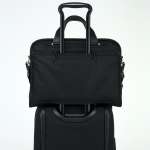 キャリーにセットできる背面のスリーブと、取り外し可能なショルダーストラップが付属しており、ビジネスシーンでありがたい仕様に。サイズは高さ32cm×幅41.5cm×マチ幅9cmで、表地はFXTバリスティックナイロン素材、ポケット部などにコーテッドキャンパス素材を使用。荷室とポケットの内装にネイビーカラーの生地を、持ち手には馴染みの良さとともに高級感も演出する牛革をそれぞれ配しています。