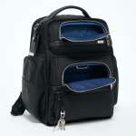 フロント側に防水ポケットを含む3つのポケット、コンパートメント内には書類を分けて収納できる中仕切りと、パッドで保護されたタブレット用ポケット、文具や小物類の収納に便利なオーガナイザーパネルを装備。
