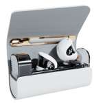 デザインにもカスタムIEMの要素が取り入れられていて、イヤホン本体には内部が薄っすら透けて見えるスケルトンデザインを採用。充電ケースは一見イヤホンのケースとは思えないラグジュアリーな仕上がりで、ホワイトとブラックはエコレザー、ネイビーとカーキはレインジャケットなどにも使われる素材“イーベント”(裏地はエコレザー)が使われているのも特徴です。