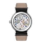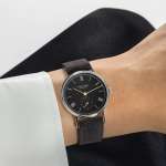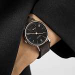 そんなノモスから登場した今回の新モデル、特筆すべきはやはりダイヤルカラー。シンプルなラウンドケースに細身のベゼル、クラシックなレールウエイ型ミニッツマーカー、インデックスにアラビア数字を控えめな表現で組み合わせるなど、“ラドウィッグ”シリーズの特徴はそのままに、ダイヤルカラーを従来モデルのホワイトからブラックへと変更したことで、全く新しいタイムピースへと変貌を遂げています。