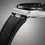 圧倒的な風格を醸し出しているのが、ストラップに採用されている“姫路黒桟革(ひめじくろざんがわ)”。これは日本古来の伝統技法である、なめしの技術と漆塗りの技術を融合させたもので、シボに手作業で漆を幾重にも塗り重ねる手の込んだもの。きめ細かな目のひとつひとつに浸透した漆が深いツヤを生み出し、小さなダイヤの粒を無数に散りばめたような美しい輝きと重厚なボリューム感を放ちます。