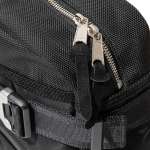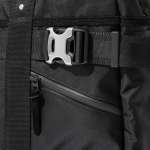 ブラックカラーとナイロン生地の質感、アルミ製のアジャスターやバックル、各部パーツを留める補強リベットが、シンプルなデザインも相まってタフさと無骨さを演出します。