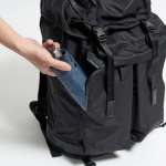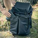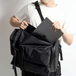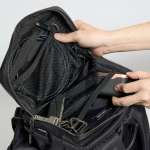 機能面にも使いやすいこだわりが満載。まず、容量30Lのメイン収納部は上部と側面の2カ所からアクセス可能で、PCスリーブも横向きに配置してPCをサイドから取り出しやすくなっています。底面に底板を配置し、自立するつくり。トップは開閉しやすい巾着型で、閉めた時に前に垂れないように巾着コードは後ろ側に取り付けられています。