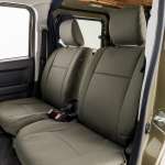 内装にもこだわりが。シートカバーには車体のカラーに合わせたコーデュラ生地を採用。フロントシートカバーの背面には、大型のポケットとモールウェビングが付いているので、車中泊のアイテムをしまったり、吊るしておいたりするのに便利です。