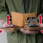 本製品はファスナーを開けてガバッと開くと、札入れ部分とカードポケットが飛び出す絵穂のようにポップアップする仕組みになっています。開発時には、飛び出し具合などがベストとなるよう、紙型を1mm単位で何度も試作して製作したとか。