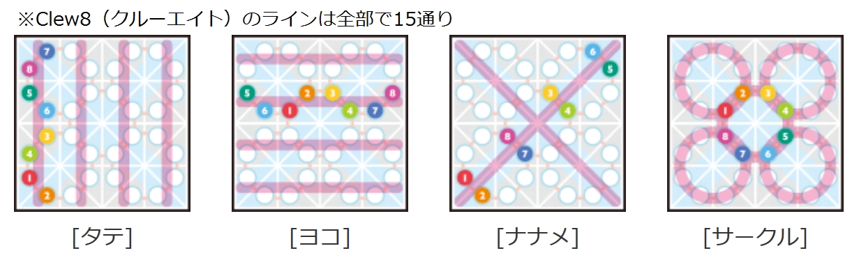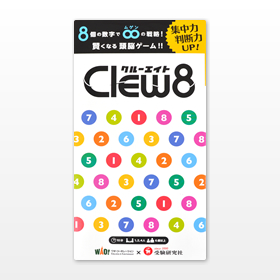「Clew8」(1944円)は8つの数字を使う頭脳ゲーム。ルールは至極単純。プレーヤーが交互に、手持ちの1~8のチップを1枚ずつ、32分割されたマス目に自由に並べます。そして、タテ・ヨコ・ナナメ・サークル(円)のいずれかのラインに、全ての数字を揃える速さを競います。8個の数字から生まれる戦略は無限!刻々と変化する状況を把握し対処していくのが醍醐味のゲームです。