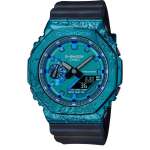 「GM-2140GEM」(3万8500円)は、八角形のベゼルとシンプルなデザインが人気の「GM-2100」がベース。“道を示す”といわれる鉱山・コーディエライトがモチーフです。ブルーIPを施したメタルベゼルと、2色の樹脂を混ぜ合わせる“ガラール成形”で作成したバンドを採用しています。