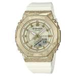 「GM-S2140GEM」(3万3000円)のモチーフは黄金色のカルサイト。ベースモデルは「GM-S2100」です。ベゼルにはゴールドIPを、文字盤と時字にはゴールドの蒸着処理を施し、鉱石の透き通った黄金色を表現。ホワイトの樹脂製バンドですっきりとした印象です。