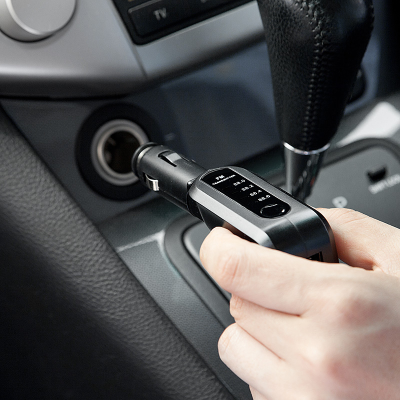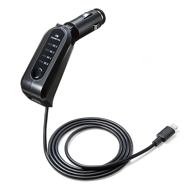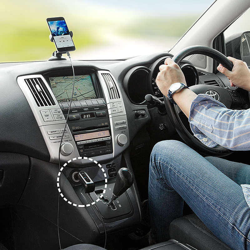 接続には車のFMラジオの周波数を選び、シガーソケットとiPhoneにつなぐだけ。「MTF-100」の周波数を車の周波数に合わせれば再生可能だ。音楽だけでなく、ナビアプリの音声やデジタルラジオ、動画などにも対応している。