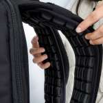 本製品には大きく分けて5つの特徴があります。1つ目は特殊素材のTPU-Lycra素材を使うことで、衝撃を吸収しながら均等に圧力を分散するというもの。リュックを背負うなど肩に荷重がかかると、本製品内のエアパッドの中の空気が移動して衝撃を吸収するため、肩に最もフィットする形をキープしたまま圧力を分散させられます。