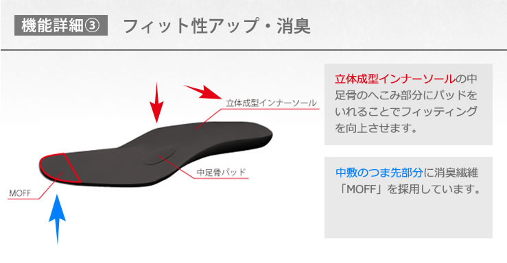 足の形に合うように考えられた立体成型インナーソール、固いコンクリートの衝撃を和らげるクッション性を備えたミッドソール、耐久性UPのために配置されたラバー。そして多機能ながらも損なわれることのない軽量さ…。