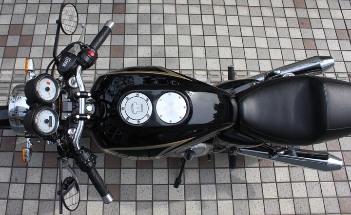 ロングタンク専用設計のシングルシート。底板は二重構造として強化されている。オールレザーのシート色やステッチ色は別途オーダー可能。