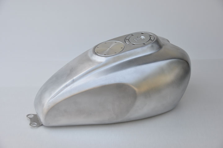 2ミリ厚のアルミ地肌で仕上げられているタンク。キャップ周りのエアロタイプデザインが特徴。