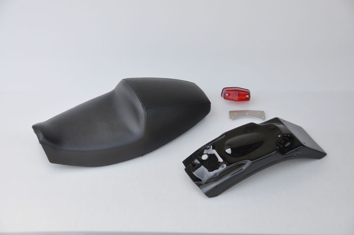 黒ゲルコート仕上げのシングルシート専用ショートリヤフェンダー。ルーカスタイプのテールランプを装備している。アルミプレート付き。