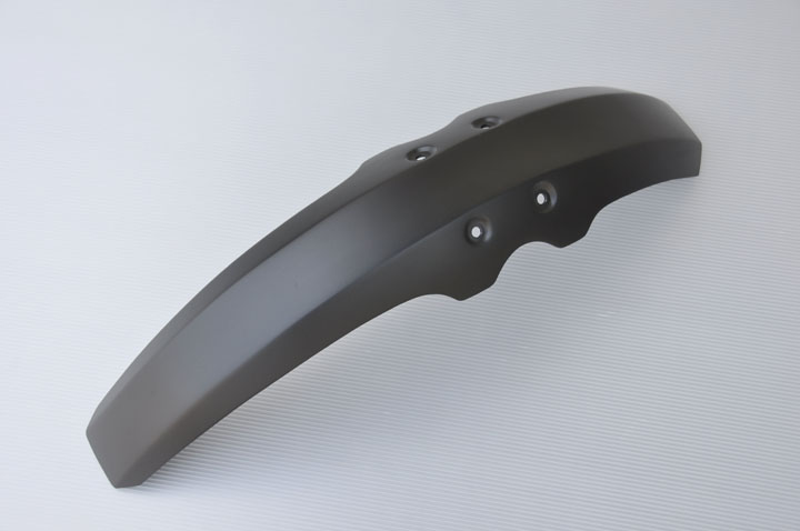 細身でシャープなデザインのフロントフェンダー。リアフェンダーと同じ黒ゲルコート仕上げ。
