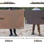 カラーは、アウトドアでも使いやすいオリーブとタンの2種類。全身を包むのにぴったりのハーフサイズ(約100×150cm)と、ひざ掛けにちょうどいいクォーターサイズ(約75×100cm)が用意されています。