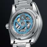 シースルーバックから見える「キャリバー9S85」のチタン製回転錘にも同様の模様を施し、さらに陽極酸化処理による爽やかなスカイブルーによって雲海の上に広がる青空を表現。グランドセイコーの獅子のエンブレムもデザインされています。