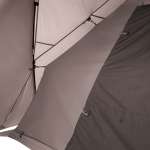 インナーテントのフロアは300×250cmの長方形で、大人4名でもゆったり休める余裕の広さ。端に行けば行くほど壁面が迫ってきてスペースを思うように使えないのがティピー型の欠点ですが、このテントではフック&ストラップでインナーテントとフライシートを連結、インナーテントの側面を外側から持ち上げることで、広い居住空間が確保できるようになっています。さらにセンターポールの他に、テント前面に前室を作るフロントポールが付いていて、テントへの出入りがしやすくなっている点も高ポイント。「ティピー型は室内が狭そうで…」なんて敬遠していた人も、これならちょっと試してみたくなりますよね。