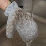 ミトンタイプで手にはめて使えるから、鍋やフライパンなどの曲面にもしっかりフィット。焦げやニオイ残りなどが気になるグリル網やコンロのごとくも気持ちよく洗い落とせます。