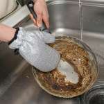 鍋やフライパン、コンロの頑固な焦げつきもピカピカになるお掃除ミトンの特徴は、表面を覆う凸凹のついたアルミ繊維。焦げや汚れに水をかけてこすり洗いするだけで、軽い力でも汚れをキレイに落とせます。焦げがひどいときは、洗剤などをつけるとさらに取れやすくなります。