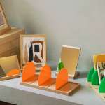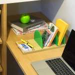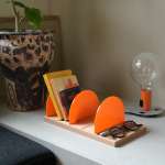 「ブックスタンド」(1万4850円)は、有機物である木材と無機物なアクリルの異素材を組み合わせたことで、どことなくモダンな印象を与える一品。美しい曲線を描く半円アクリルプレートの鮮やかなカラーリングが木口のストライプの色とそろっており、目を引くデザインとなっています。