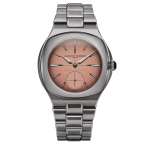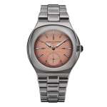 ダイヤルは濃淡のグラデーションが美しいサーモンピンクのオパライン仕上げ。18KWG製にルテニウム処理を施した時分針は、アセガイ型と呼ばれる特徴的な形状です。ユニークなドロップ型のアワーマーカーには、針とともにホワイトのスーパールミノバを塗布。薄暮のサーキットでもはっきりと時間を読み取れる判読性を確保しています。