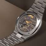 ベゼルは2019年発表の「グランドスポーツ トゥールビヨン」を踏襲したクッション型。スポーティな三連メタルブレスを採用し、よりスポーティさを演出しています。ケースとブレスレットには軽く耐久性に優れたグレード5チタンを用いることで、ボリュームのあるデザインながら118gという驚きの軽さを実現。柔らかなラインや、サテン仕上げと鏡面仕上げの使い分けが生み出す躍動感も、じつに見事です。