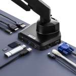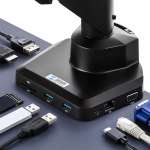 クランプによりデスクに固定しますが、このクランプ部にドッキングステーションを搭載。Type-CのUSBポートは2口用意され、一方は充電専用です。こちらにノートPCの純正PDアダプタなどを接続すれば、充電しながらも使用可能。