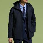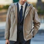 腕の動きを妨げないピボットスリーブを採用し、腕まわりや胴まわりにゆとりをもたせることでスーツのジャケットの上に羽織っても窮屈感はなし。コートほど長すぎず、ジャケットが隠れるくらいのちょうどいい着丈もポイントです。