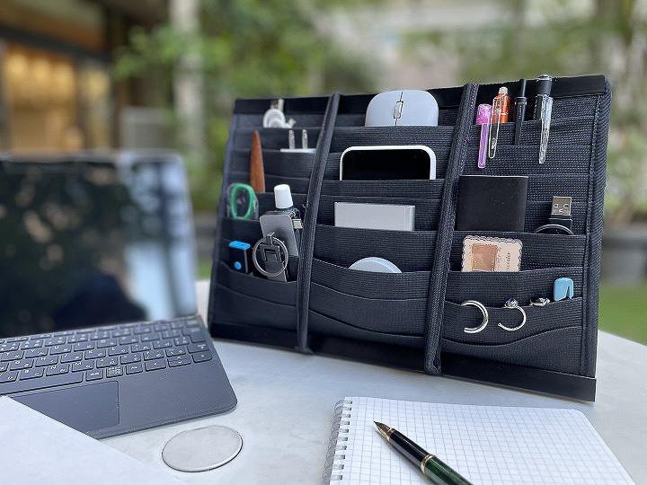 オフィス以外でも作業するノマドワークが市民権を得て以降、モバイルガジェットや文房具など持ち歩く小物も増えています。その際に役立つのがバッグインバッグですが、従来のものは、「入れた小物はどこ!?」「小分け用ポケットのサイズが微妙」「自立しない…」など、人によっては不満を感じることも。