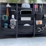 最大の特徴は2022年6月に特許取得の“多層バンドポケット”。ボードに収縮バンド9枚をずらして重ねた形状で、その隙間からモノを入れて収納する仕組みです。ポケットの深さは収納物の大きさによって可変。また、縦の仕切り(デバイダー)を動かせば、ポケットの幅も変わるので、大きめのタブレット・ノートPCから小さなUSBメモリまで多様な小物を収納可能に。