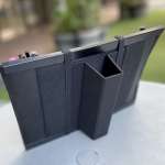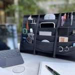 さらに裏側にはスタンドプレートが設けられており、デスクやテーブルの上に自立させておくことも可能。そのため、小物を取り出す際にいちいちカバンに出し入れせずに済みます。また、カフェなど狭いスペースでも効率的に作業が可能です。本製品はボード状のため、収納するカバンがショルダーバッグであっても、バッグ自体がへたらず、自立しやすくなるというのもメリットです。