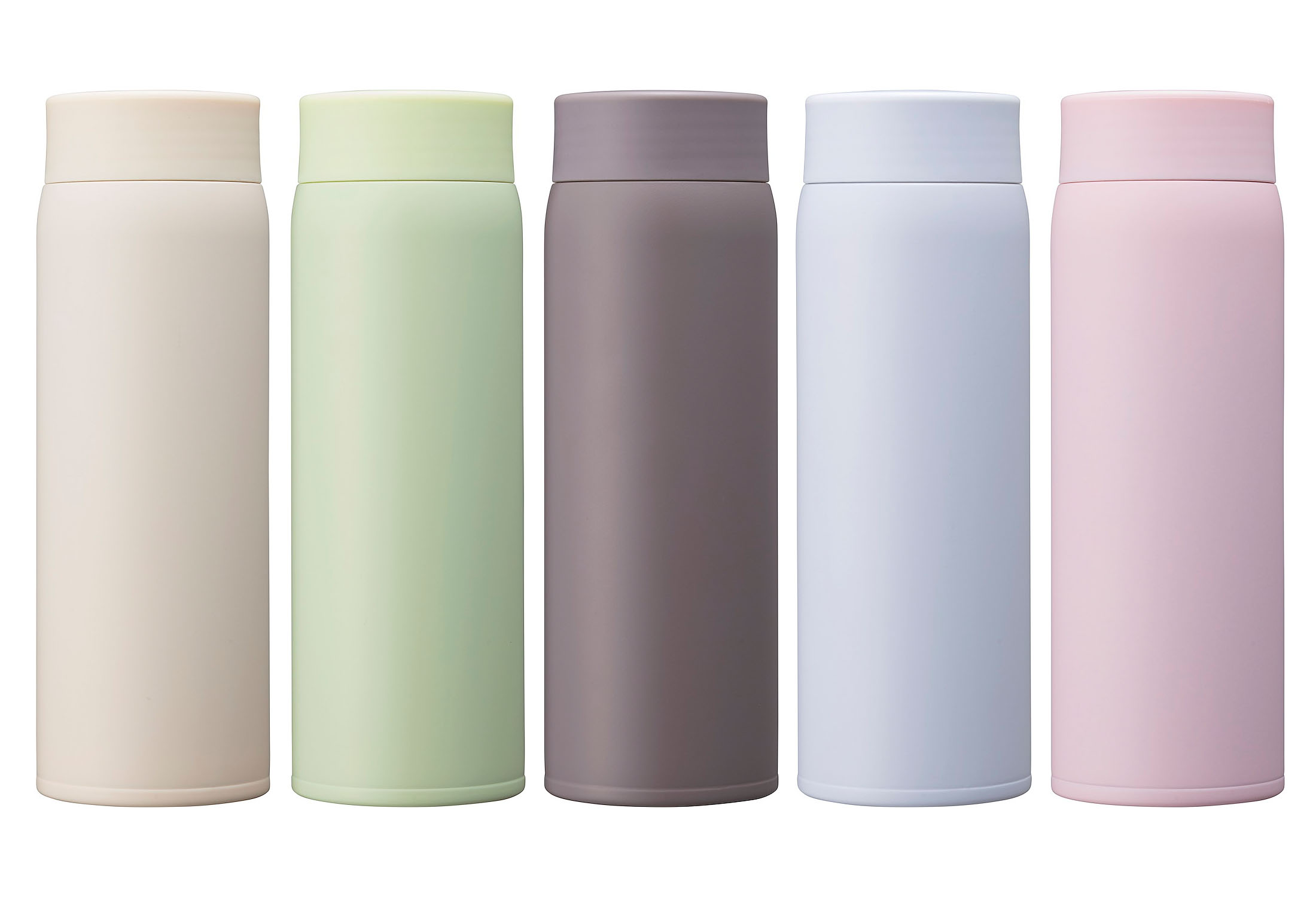 この「ふわふわAirボトル」、ステンレス瓶部分だけではなく、フタの樹脂部分にも軽量化を施し、180gという軽さを実現しています。それにしても、なぜふわふわなのか? それは、表面塗装をマットな質感に仕上げることで、持ったときにふわふわした感触になっているから。実際の重さ以上に軽く感じるボトルなのです。