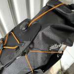 ロゴグラフィックはリフレクター素材となっており、夜間の視認性を高めます。フロント面にはオレンジのカラーが印象的なバンジーコードやバッグの圧縮用コードを搭載。