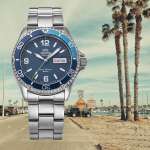 文字板とベゼルは昼のビーチサイドをイメージしたライトブルーを基調とし、アクセントとして秒針先端にイエローカラーを採用。ルミナスライトを施したインデックスと時分針の淡いホワイトは、ダイバーズデザインながらも重すぎない印象を与えます。