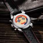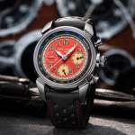 メインカラーの朱赤は鮮やかなレーシングカーが唸りを上げながらサーキットを疾走する姿を、テレメータースケールや30分積算計、12時間積算計に配されたパール感のあるクリーム色は、勝利の栄光を想起させるもの。ふくよかなリーフ型の針にはクリーム色の蓄光塗料をあしらうことで、暗所での視認性を確保するとともに、古き良き時代を思わせる郷愁を漂わせます。