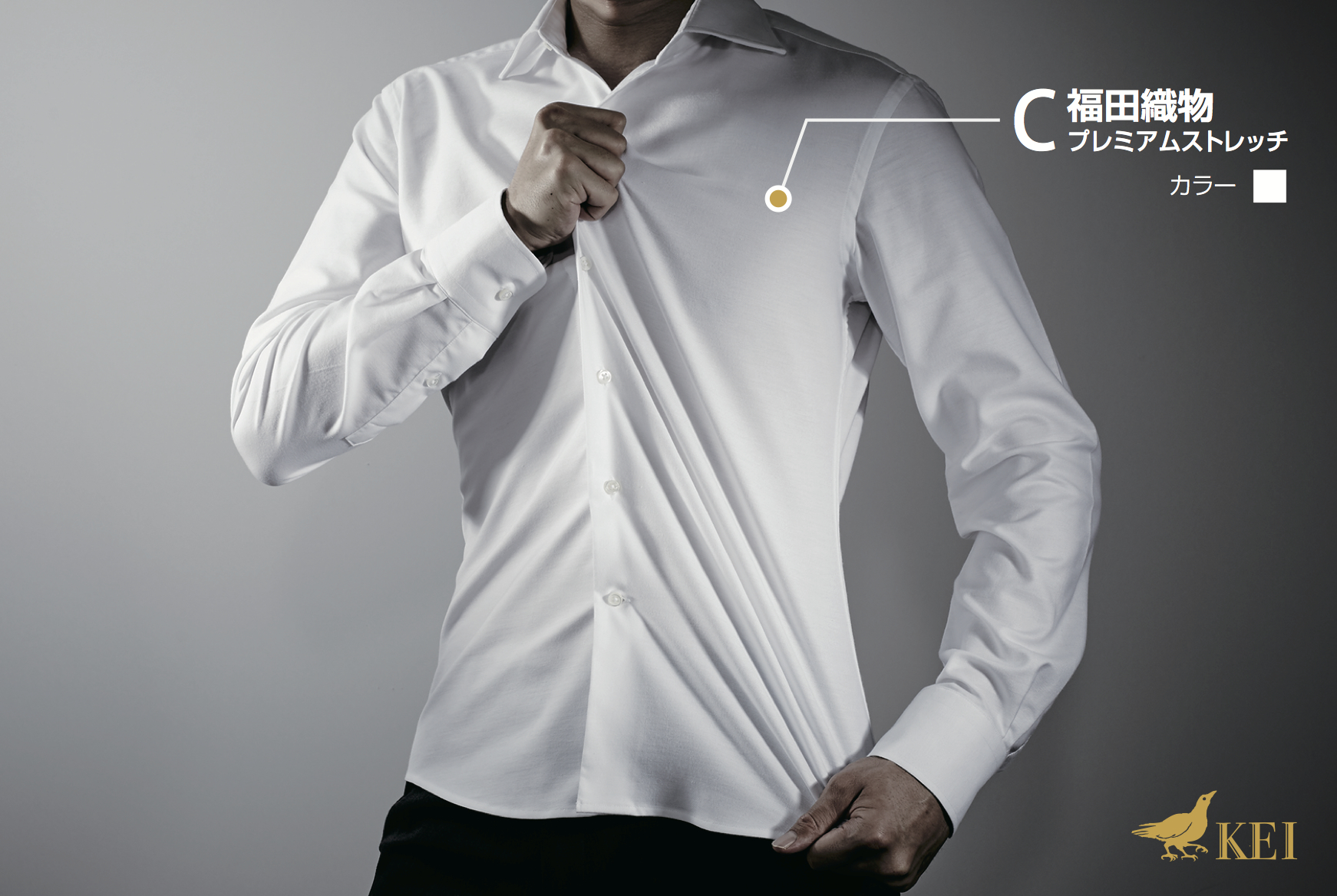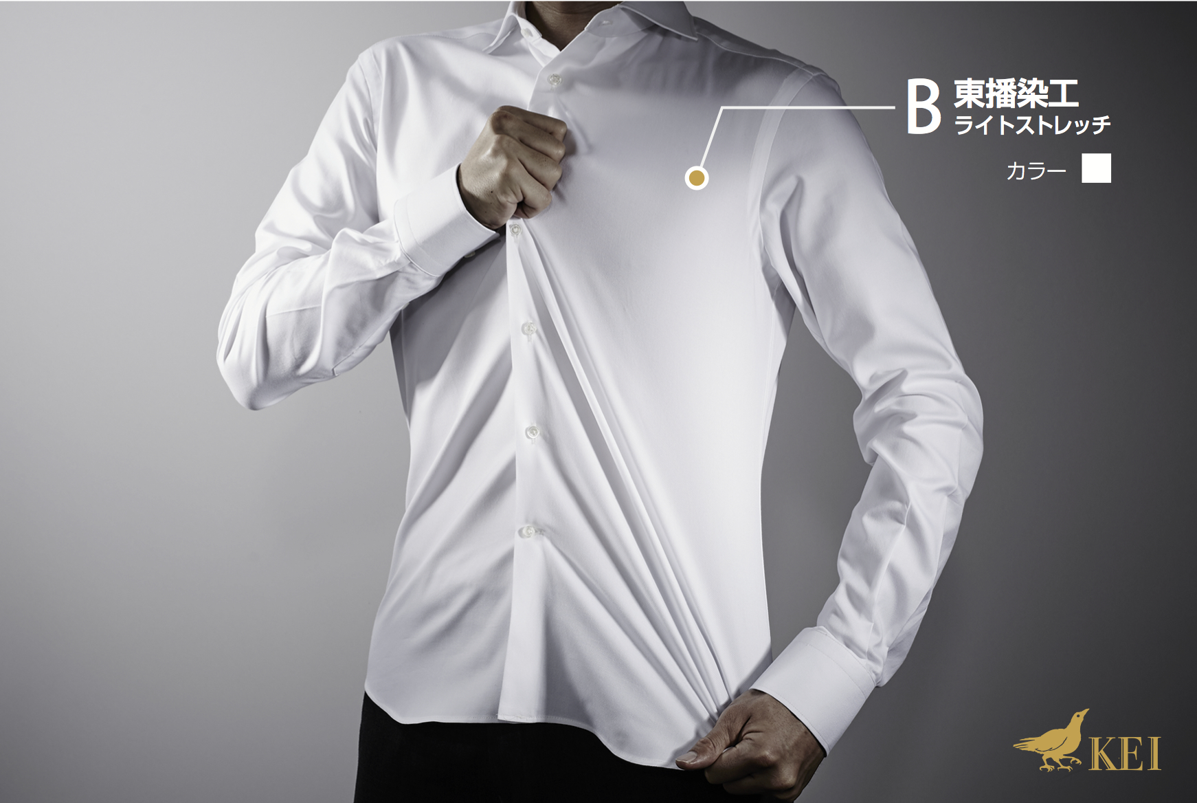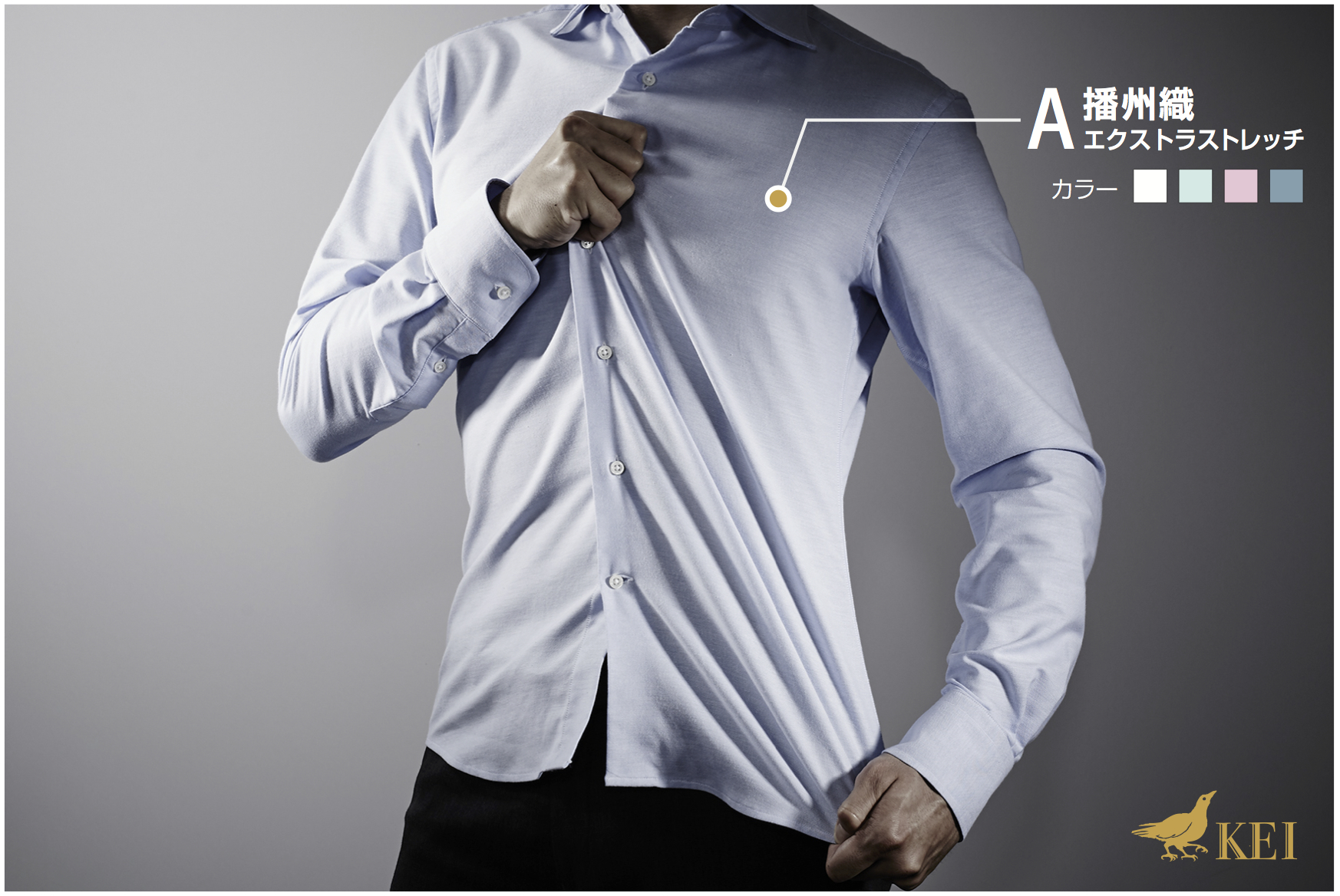 このオーダーメイドシャツの特徴は『永久ストレッチ生地 』を使っていること。永久ストレッチ生地とは耳慣れない言葉ですが、オーダーメイドシャツの「KEI」が織産地の職人たちと開発した特別生地。綿100%なので丈夫で劣化しにくい上、特殊な織り方と加工を施すことで、ドレッシーながらも適度なストレッチ性もあります。今回は播州織、東播染工、福田織物から選ぶことができます。