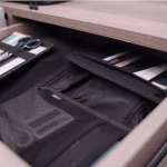 マグネット収納ボードはフラット形状なので、そのまま引き出しに入れて収納しておくことも可能。文房具などの場合はデスク上にトレイ代わりにおいておくこともできます。