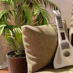 この「aiwa play RX01」、デジタル機器を製造販売するaiwaデジタルブランドからこの春登場の新製品。もともと国際特許取得のサウンドギア「インスタコード」をベースに開発されたもので、本体はミニギターを思わせるフォルム。ネック部分にはテンキーとボタン、ボディ部分には6本の感圧パッドとスピーカーを搭載しています。