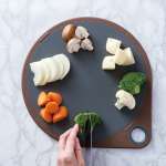 まずは、その形状によるメリットをご紹介。丸いと長方形のものより奥行きをたっぷりとれるので、作業スペースを広く確保できます。一カ所でニンジンを刻んだら、クルっと回転させて隣で玉ねぎをカット。また回転させて、今度はジャガイモ…といった具合で、切った食材を仮置きしながら使えます。これなら洗い物も軽減できそう。