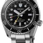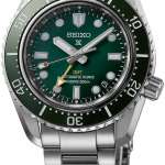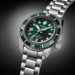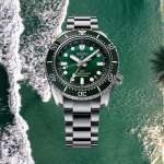 逆回転防止機構を備えたベゼルには、表示板に耐傷性に優れたセラミックスを採用。風防には内面無反射コーティングのサファイヤガラスを使用しています。200m潜水用防水を備えた本格的なダイバーズスペック。ダイヤルは見る角度によって濃淡が変化するサテン仕上げで、グリーンとブラックの2色で展開されます。