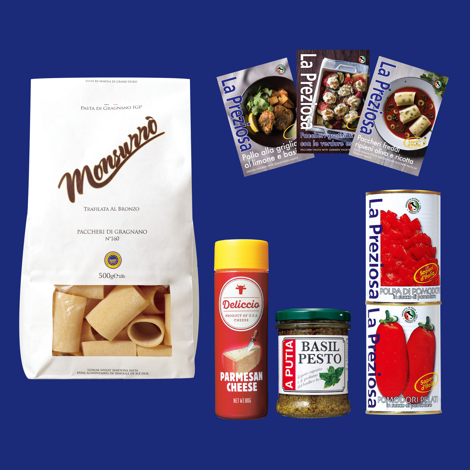 ビッグトマト缶の中に入っているのは、トマトソースパスタが作れるセット。