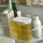 冷蔵庫の棚サイズにピッタリと収まるW146×D90×H160mmという絶妙なサイズ感に仕上がっています。また、無駄なスペースを作らないよう取っ手も排除。片手で取り出したら、傾けて注ぐだけのシンプルで扱いやすい形状です。